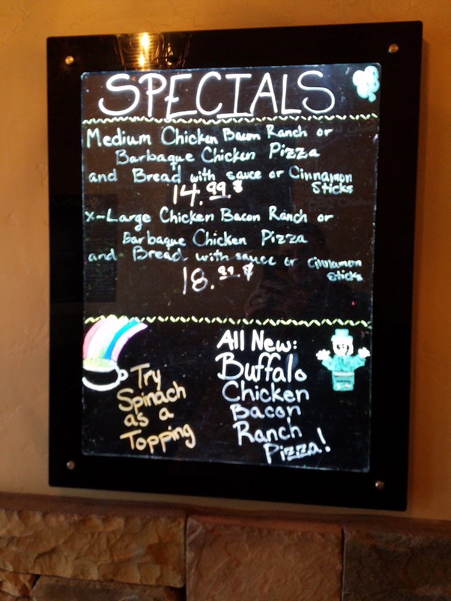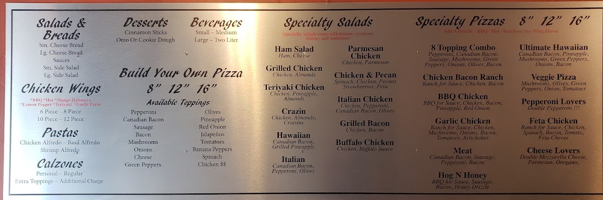 Marinara for Sauce, Mozzarella Cheese,Canadian Bacon, Pepperoni, Sausage, Bacon, Green Peppers, Onions, Olives, And Mushrooms.